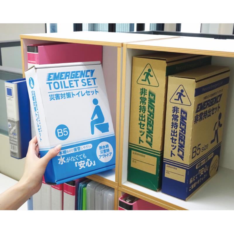 ●B5ファイルサイズ化粧箱入でコンパクトに備蓄可能なトイレ処理キット。