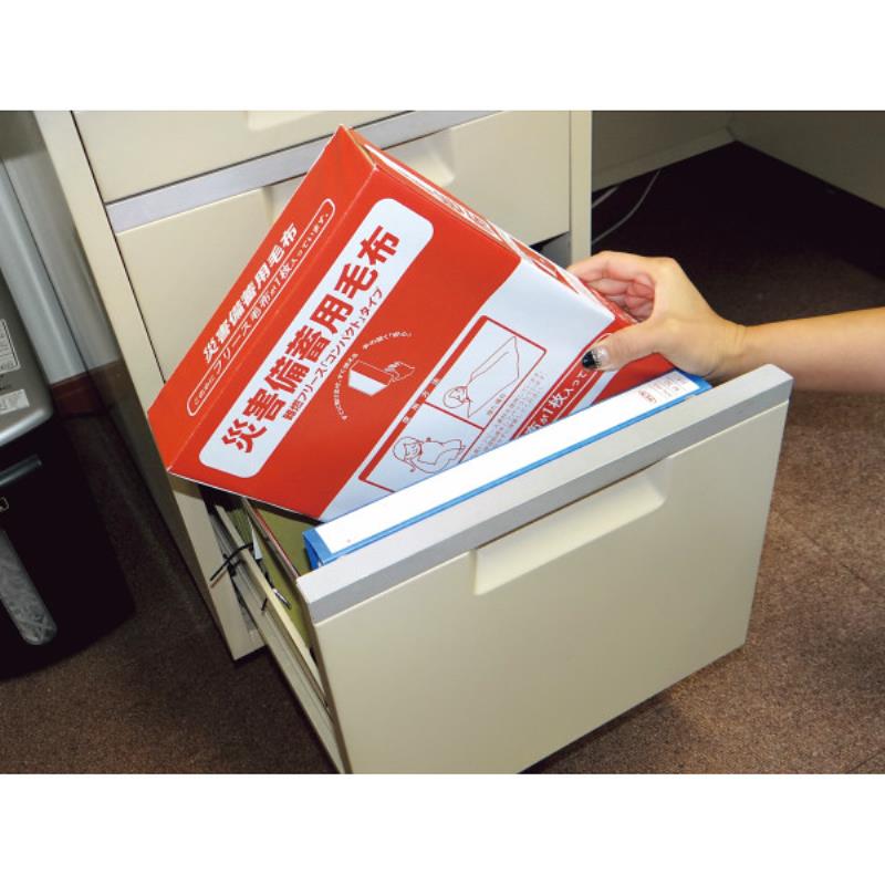 A4ファイルサイズケースなので書棚・引出しなど身近な場所に無理なく保管できるだけでなく、いざという時にすぐに取り出せます。「防炎性能試験」に適合し認定を受けたフリース難燃毛布を長期保管に欠かせない独自の水分除去技術で除湿処理をし、コンパクトな真空パックにしました。(処理・包装ともにISO14000・9000取得 日本国内工場で対応)