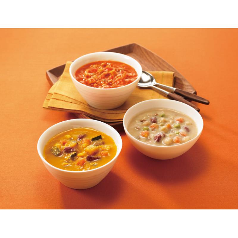 1食当たりの食塩相当量は1g以下。化学調味料・着色料不使用。野菜の旨みを活かした、4種類のスープを詰め合わせました。トマト、きのこ、豆、かぼちゃの各スープの味わいが手軽に楽しめます。