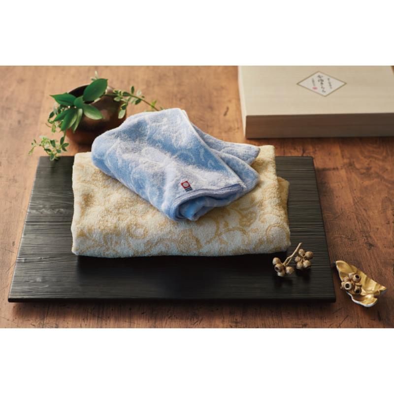 今治の自然を感じる色彩で丁寧に織り上げた情緒あふれる和更紗模様の今治タオル。美しい今治タオルを木箱に詰め合わせた丁寧な贈りものです。