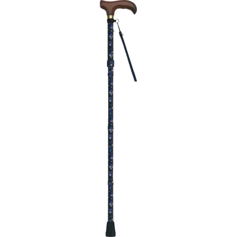 華やかな花柄の折りたたみステッキ。持ち運びに便利な携帯袋付き。長さの調節も簡単にできます。折りたたみ時27cmとコンパクト。安心のSGマーク付き。