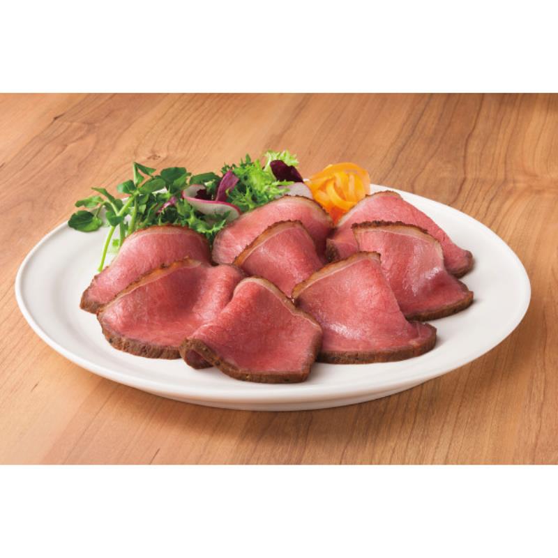 田崎真也監修ローストビーフ。国産牛の旨みを引き立てるため、『焙煎黒胡椒』『焙煎オニオン』を使用し、しっとりジューシーに仕上げた贅沢な味わいのローストビーフです。