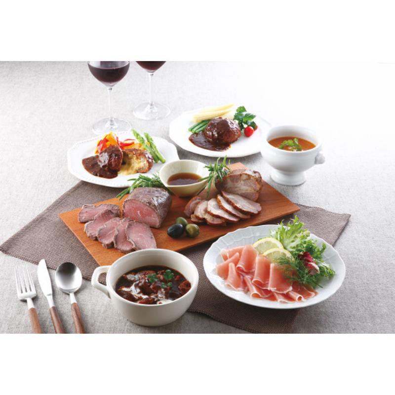 商品内容:●ローストビーフ(もも)200g、ローストポーク160g、トリュフ入りグレイビーソース30g、生ハムスライス45g、ビーフシチュー180g、オマール海老のビスク150g、デミグラスソースハンバーグ(牛肉・豚肉使用)・デミグラスソースチーズ入りハンバーグ(牛肉・豚肉使用)各120g×各2