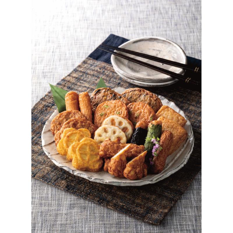 商品内容:●特揚げ棒天・いわし棒天・おいも天×各4、ごぼう天・にんじん天・れんこん天・枝豆天・五目揚・梅おはら揚×各2、のり巻・しそ巻×各1(11種26個)
