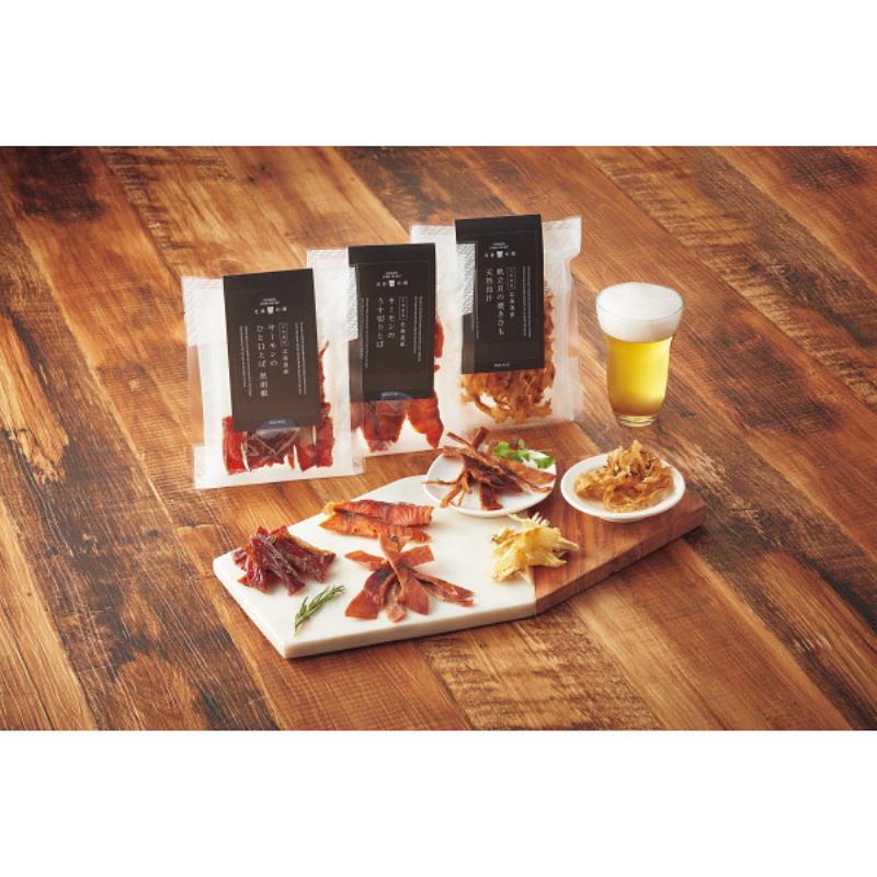 商品内容:●やわらかあたりめ22g、サーモンの薄切りとば30g、手焼きつまみ鱈30g、いかオリーブオイル&ガーリック22g、サーモンのひと口とば黒胡椒33g、帆立貝の焼きひも40g※包装済み商品です。