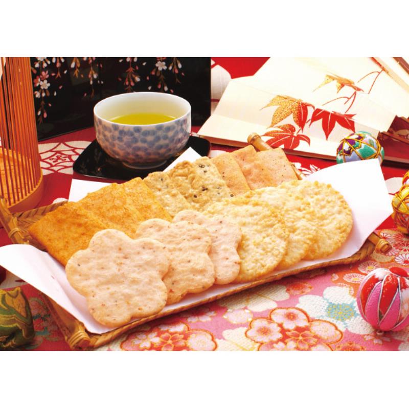 国産米100%の煎餅の詰合せです。加賀友禅をモチーフに色鮮やかにデザインされた目で見てきれいな米菓ギフトです。