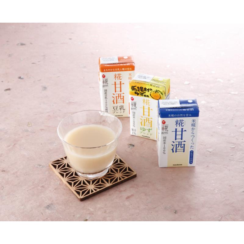 プレーン、豆乳ブレンド、柚子ブレンドの3種類の糀甘酒が入った詰合せです。砂糖不使用、アルコール0%の甘酒で、幅広い方におすすめです。