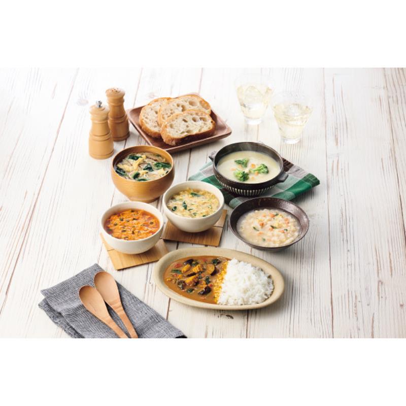 商品内容:●Theうまみ 特製たまごスープ×4、Theうまみ 旨辛チゲスープ・Theうまみスパイスカレースープ×各2、にゅうめん すまし柚子・ほぐし身入り さけ雑炊・炙り たらこ雑炊・彩り野菜のクリームシチュー・野菜と鶏肉のカレー・ひきわり豆のトマトカレー×各1(計14食)(フリーズドライ)