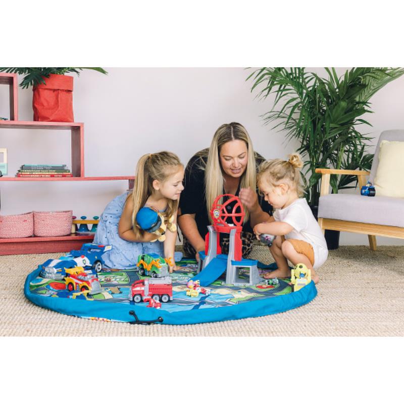 直径140cmの大型プレイマットとして遊んだ後、おもちゃを載せたまま付属の紐を引っ張って引き絞ると丸ごとお片付けができます。外側にはジッパー付きの収納ポケットが付いており、小さいおもちゃや細かい部品等、紛失しやすいものを収納するのに便利です。外側はパウ・パトロールの楽しいキャラクター柄、内側はクルマ遊びや電車遊びが楽しめる道路や線路のイラストとなっていて大好きなキャラクターの世界を満喫できます。